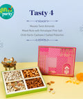 Experience a bold medley of flavors with Nutso's Tasty 4 collection. This premium mix includes fiery Chilly Cashew, rich Smoked Almond, zesty Pepper Pistachio, and a delightful blend of Mixed Nuts seasoned with pink salt. Each nut is crafted to perfection, offering a satisfying crunch and a burst of flavor in every bite.