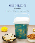 A curated combination of two beloved treats: Kaju Kathli (250 grams) and Bombay Mixture (250 grams). This delightful blend of rich, nutty sweetness and spicy, crunchy goodness is the perfect indulgence for any occasion.